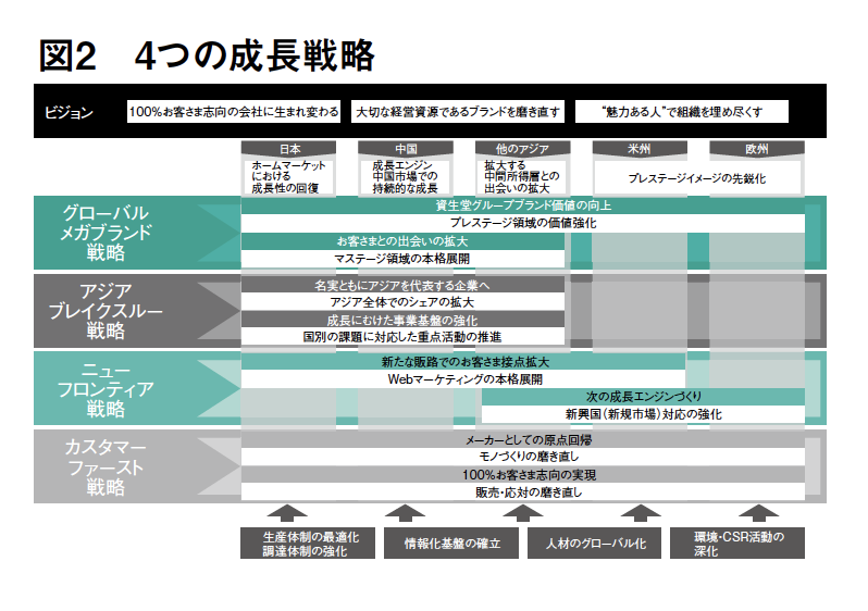 2008年に示された「10年後に輝く資生堂の姿とこれに向けてのロードマップ」では、その柱は言うまでもなくグローバル化であり、2011年度からは、グローバル化の第2フェーズ「成長軌道に乗る」ことを目指し(図1)、末川新社長の下、「4つの成長戦略」を構築し(図2)、リージョンごとに「グローバルメガブランド戦略」「アジアブレイクスルー戦略」「ニューフロンティア戦略」「カスタマーファースト戦略」の実行段階に入っています。