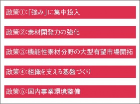 「政策①:『強み』に集中投入」では、化学企業が需要者にとって不可欠なパートナーとなることを目指し、自社の「強み」に集中投入できるよう政策的に支援する。「政策②:素材開発力の強化」では、企業が外部リソースを積極的に活用するとともに、デジタル化の流れを捉えた取り組みの推進を後押しする。「政策③:機能性素材分野の大型有望市場開拓」では、わが国製品に有利な国際ルールの普及による新しい市場づくりの支援などを行う。「政策④:組織を支える基盤づくり」では、学生や若手社員、熟練技能者を育成・確保するとともに、優秀な外国人材がわが国で活躍できる魅力ある雇用システムの整備を目指す。そして「政策⑤:国内事業環境整備」では、国際競争力強化につながる規制改革、税制改革等を推進していく。