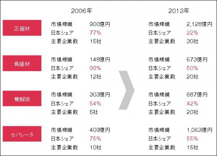 例えば、リチウムイオン電池の主要4材料のシェアが 2006年から 2013年の間にどれだけ変化したかを見れば、成長市場における競争の激化は部素材といえども免れ得ないことは明らかである(図1)。