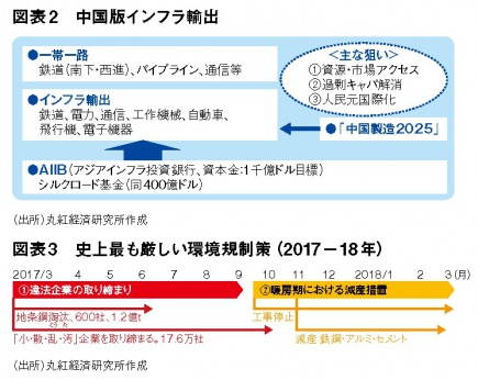第三に、史上最も厳しい環境規制である。2017年は『大気汚染防止行動計画(2013-17年)』の最終年に当たる。目標達成のため、冬から史上最も厳しい規制が発動される。具体的には、大気汚染が深刻な28都市(北京と天津の2都市+河北省・山西省・山東省・河南省における26都市)において、石炭を多く消費する暖房時期(2017年11月15日-2018年3月15日)になると、鉄鋼は50%、電解アルミは30%以上、アルミナは30%の減産が強いられる。他にも、マンションやインフラ関連の建設工事の停止やセメント、建材の生産停止・減産が予定される(図表3)。