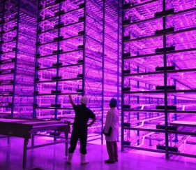 タバコの育成に最適な紫の光となっています。温度や湿度も管理し、必要最低限の水やエネルギーを使用するエコな工場です。