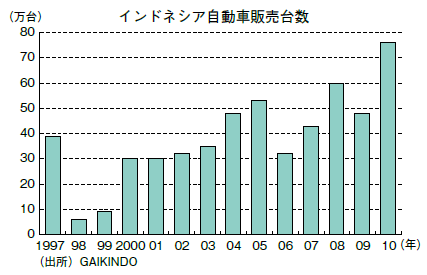 堀(ホンダ) 2010年、インドネシアの1人当たりGDPは3,000ドルを超えた。二輪車の需要は1,000ドルを超えたあたりから立ち上がり、2,000から3,000ドルで急速に伸びるといわれるが、2010年の二輪車販売台数は740万台で過去最高を記録した。2011年は、さらに伸びて820万台程度を見込んでおり、中期的には、2015年から2020年にかけて900万から1,000万台の大台に届くという認識を持っている。