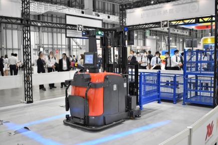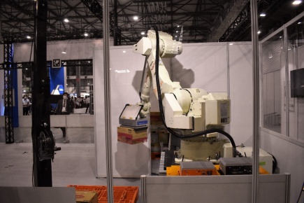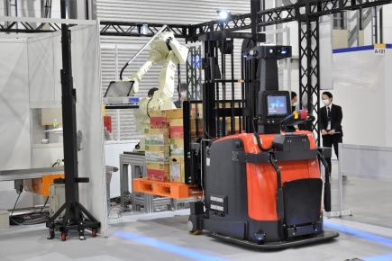 岡谷鋼機株式会社はVision Nav Robotics社製の「無人フォークリフト」、Mujin社製の「デパレタイズロボット」、岡谷システム社製の「倉庫管理システム(WMS)」を組み合わせ、入荷作業の無人化の流れを実演紹介した。「無人フォークリフト」はビジュアル識別技術を備え、さらに独自の技術を使用して、異なる種類のパレットを識別。4段以上の段積みという難易度の高いタスクを実現した。「デパレタイズロボット」は、世界ナンバーワンの搬送能力を有し、これまで難しいとされてきた、大きさの異なるケースも運び入れできる。さらに荷下ろし後の在庫管理を「WMS」で効率化する。この一連の作業で倉庫業務を自動化し、未来の倉庫作業を形にしてみせた。