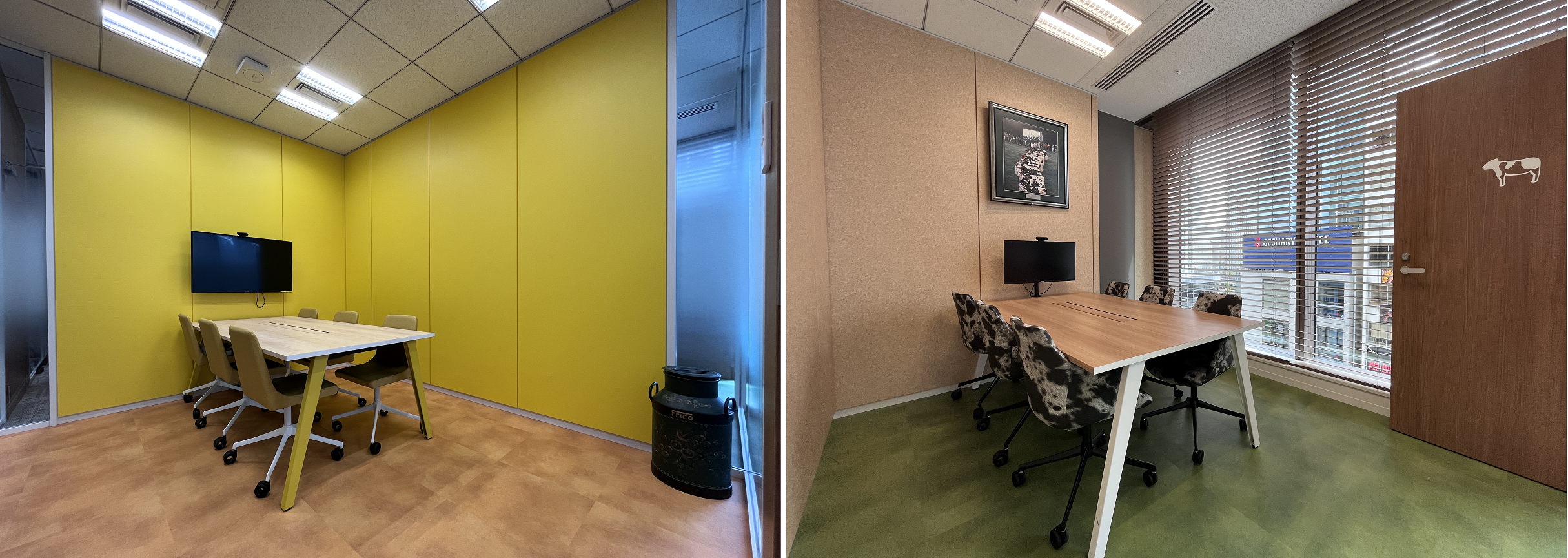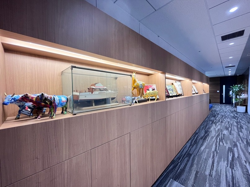 会議室の内装について、チーズ、デニム、牛など当社が扱っている商材をコンセプトとしてデザインし、少しでも楽しく仕事ができるように工夫しました。また、来客エリアの廊下には、これまで社長室に置かれていた調度品を飾ることで、お客さまとの会話の中で話題となるようにしました。