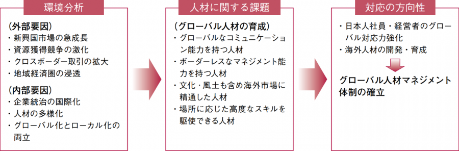 新興国市場の急成長に象徴される世界規模での経済社会環境の変化は、企業の経済活動において、地域や事業領域の広がりだけでなく、多様な文化や価値観の中でマルチなWin-Win関係を築くことを要求している。こうした環境変化の中、企業はグローバル人材の育成が重要な課題であると認識し、日本人社員・経営者のグローバル対応力の強化や海外人材の開発・育成の施策を実施してきた。