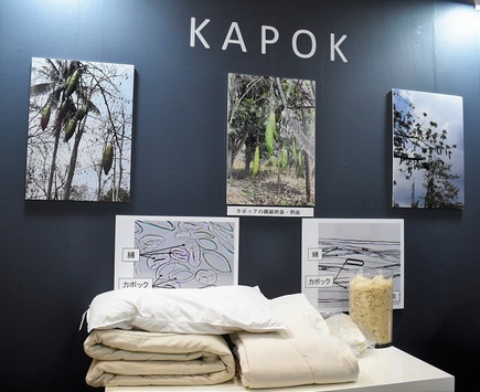 カポックはアオイ科の落葉樹。カポックの実の綿を使い特殊加工を施した素材を使用した寝装製品を展示した。