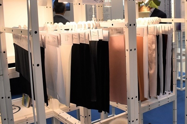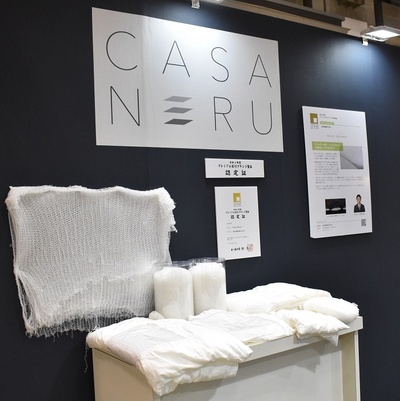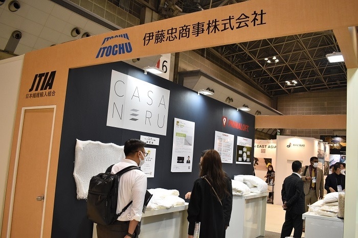 日本繊維輸入組合のブースでは、サステナブル素材であるカポック(KAPOK)、PrimaLoft、独自ブランドのカサネル(CASANERU)を使用した寝装製品を紹介した。カサネルに採用しているノミ ウォーマー(Nomi Warmer)はストレッチ性、吸放湿性に富む素材。さらに、長繊維を連結して作られている素材なので、中綿の下落・移動が起きず、羽毛や短繊維に比べて埃の発生を100分の1以下に抑えられるという特徴がある。