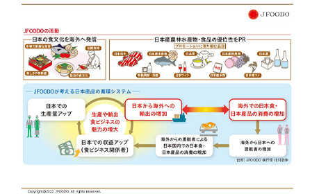 政府は2006年に農林水産物・食品の年間輸出額を1兆円に拡大するという目標を定めました。農林水産物・食品のさらなる輸出拡大のためには海外での需要創出が不可欠でしたが、当時の日本には、海外の消費者に日本の食をプロモーションする専門機関がなかったため、JFOODOが設立されることとなりました。