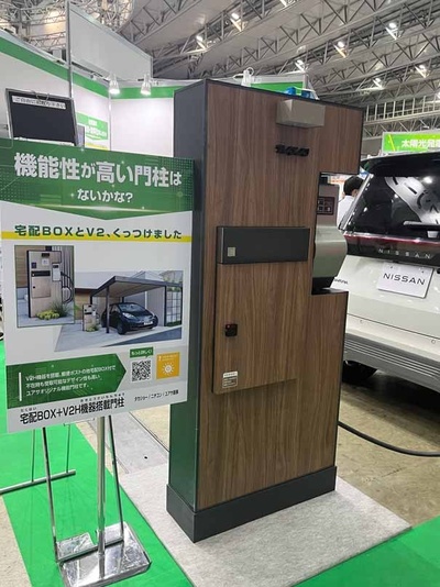 例を挙げると、『V2H機器搭載宅配ボックス付門柱』があります。再生可能エネルギー分野で多数の販売実績を有するユアサ商事と、ガーデン・エクステリアメーカーである株式会社タカショー、V2Hシステム(注2)を業界に先駆けて開発したニチコン株式会社の3社が、デザイン性にも優れ、V2Hシステムや宅配ボックスなどのさまざまな機能を備えた機能門柱を開発しました。宅配便の再配達問題とエネルギーの効率的利用、台風や自然災害による停電対策を掛け合わせた今までありそうでなかった商品となっています。