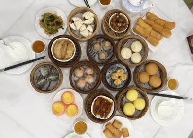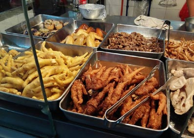 広東料理の代表とした広府菜といえば、やはり飲茶です。飲茶の発祥地は広州か香港か曖昧にされますが、発祥地は広州です。清朝時代咸丰同治年間に、広州の「一厘館」という店から始まりました。当時、テーブルと椅子しかない粗末な店でしたが、時の流れにつれ、今の飲茶の形になりました。よく知られる長年の歴史を持つ飲茶レストランは「広州酒家」、「利苑酒家」、「陶陶居」などですが、最も人気を集めるのは「泮溪酒家」です。60 年を超える歴史を持つこの老舗はさまざまな国家首相や海外著名人を接待したことがあります。また、広州三大庭園レストランの一つですので、嶺南文化が十分に伝わる設計の中で、景色を眺めながら飲茶を満喫することができ、都会の騒喧(けんそう)をしばし忘れさせてくれる素晴らしい場所です。写真は、会社近くのレストランの飲茶です。12元(約200円)/蒸籠(セイロ)とリーズナブル、蒸したてを自分で取るスタイルで、温かく很好吃(おいしい)です。実は、広州人にとって飲茶の食卓に欠かせないものは鳳爪(鶏の爪)です。「四つ足はテーブル以外は何でも食べる」と昔からいわれてきた広州人は確かにあらゆるものを食卓に運びます。鶏の爪を揚げてから蒸し、汁がたっぷり浸み込んだ上、食感もびっくりするほど柔らかく、骨も簡単に取れます。それに豊富なコラーゲンが美肌にも効くというところは女性に大人気です(見た目が…正直、私はあまり得意ではありません…)。爪までも食べる鶏料理は広州食文化に欠かせないものと言っても過言ではありません。「鶏なしに祝宴にならず」といい、料理人は工夫を凝らして、たくさんの鶏料理を生み出しました。素材のうまみを味わう白切鶏、塩味と新鮮さを一体化させたカリカリとする泥 鶏、茶葉で燻製された香ばしい茶香鶏などなどです。お客さまを招待する際に、鶏料理がないと、大変失礼なことだと思われます。