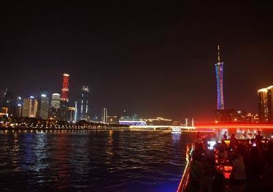 広州の観光といえば、広州タワー、中山記念堂、陳氏書院、長隆動物園等が挙げられますが、一番のお薦めは、市内を西から東に流れる珠江の両岸に出現する夜景です。この景観を船上から観賞するのが「珠江ナイトクルーズ」です。夕暮れ時から暗闇が深くなり明かりが増えていく時間帯が一番きれいで、右手に広州タワー、左手にライトアップされた珠江新城の高層ビル群は、迫力があります。陸上交通網の充実につれて広州では、それぞれの町港がナイトボート専用の港となっており、結果としていろいろなタイプのナイトボートが登場しています。一般的なコースの所要時間は1.5-2時間程度で気軽に楽しめます。