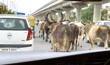 通勤時に車中から撮影した、道路を歩く牛の群れ