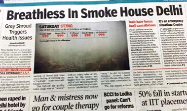 大気汚染について報じるデリー地元紙。街全体にもやがかかっている