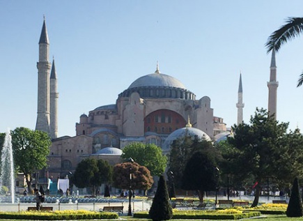 ローマ時代の360年に東方正教会の大聖堂として創設され、途中、市民暴動で3度の火災に見舞われるも、その都度、再建されました。ビザンチン帝国時代の537年にユスティニアヌス帝が莫大な予算を投じ、巨大ドームを備えた大聖堂を建設し、今もなお、大聖堂としては世界最大級の規模を誇ります。イスラム教のオスマン帝国時代になると、モスクに改修され、堂内のキリスト教芸術であるモザイク画はしっくいで隠されましたが、1934年に米国の調査団によって、しっくいの下からモザイク画が発見されました。アヤソフィアは、キリスト教芸術とイスラム芸術の融合を目にすることができます。まさに時代に翻弄され、波乱の歴史を語るビザンチン建築の最高傑作です。