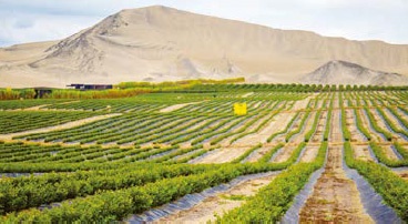 上述の通り、ペルーの沿岸部は砂漠地帯です。当地では、雨が降らない日照量の多いこの砂漠エリアを、アンデスからの水を使った大規模なかんがい設備を整備することで巨大な農地に変えています。砂漠で農業?と思われるかもしれませんが、砂漠なのにあまり気温が高くならない(30℃程度)ため、水・栄養素を管理しさえすれば、豪雨や台風の自然災害がないことから、計画的に作物を育成できる利点となるのです。通年で栽培・収穫できる作物も多く、輸出競争力あるビジネスに育っています。