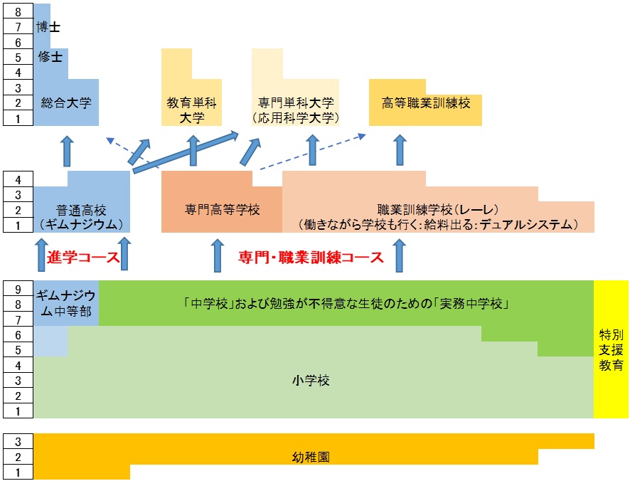中学校には、入試のある「ギムナジウムの中等部」と、入試のない中学校(「普通中学校」と、勉強が不得意な生徒のための「実務中学校」)がある。高校は、「進学コース」だと普通高校のギムナジウムに行き、「専門・職業訓練コース」だと主に専門高等学校か職業訓練学校(見習いで週3-4日働きながら(給料が出る)、学校で週1-2日専門知識を学ぶ)に行く。その後は、総合大学、教育単科大学、専門単科大学、高等職業訓練校へと進むか就職する。軌道修正はとても大変だが、必要な資格さえ取得すれば可能。12の総合大学(二つの連邦工科大学と10の州立大学)へは学生全体の20%が入学するが、卒業できるのはその5-7割しかいない。大学教授陣と大学生に外国籍者が多い(教授陣では60%以上)ことも特徴だが、それはスイスにとって大事な優秀な人的資源であり、国際化や国際競争力の向上につながるので良いとのこと。