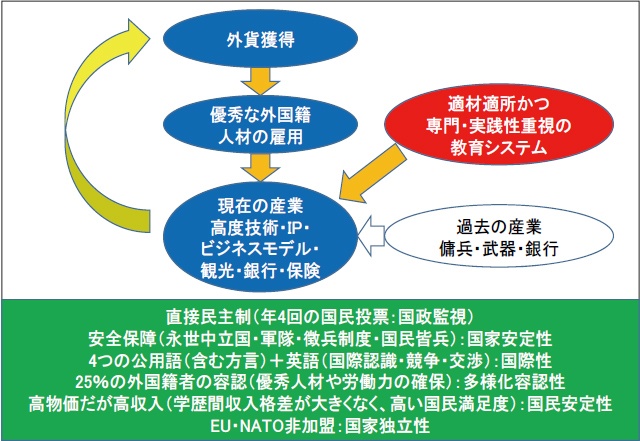 ここに記載してないことも幅広く調査した結果、私は「スイスの仕組み」を図2のように理解した。つまり、歴史がつくった文化(国民投票による直接民主制、徴兵制を伴った永世中立国という安全保障、国際理解・協調性・交渉力・競争力・プレマーケティングに重要な多言語公用語と高い外国籍者比率)に立脚し、海外からの優秀人材の確保(この方法も素晴らしいが割愛)と、国民が納得する適材適所的かつ専門性と実践性を重視した教育システムを用い、外貨獲得産業(昔は、傭兵・武器輸出・銀行**等。今は、高度技術、知的財産権(IP)、新規ビジネスモデル、観光、銀行**、保険等)を創出・育成するという成長サイクルを回すことが、「スイスの仕組み」である。(**:銀行のビジネスモデルは異なる)