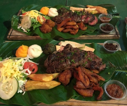 日々オフィスで仕事をしていると、12時ごろになるとキッチンのドアの隙間からさまざまな香りが漂ってきます(嗅いだことないような香りもありますが(笑))。コートジボワールでは、フレンチ、イタリアン、レバノン、中華、韓国、ドイツ、メキシコ等々、かなりレベルの高い世界中の料理が食べられます(残念ながら本物の日本食は存在しませんが)。イボワール人はなかなかの食通で、コートジボワール料理はまさに風味の玉手箱、さまざまな種類のソースやグリル料理、海の幸をベースとした西アフリカのあらゆる風味がそろっています。代表的な料理には、ケジェヌ(チキン、または魚のトマトソース煮込み)、ソースゴンボ(オクラスープ)などがあり、米やアチェケ(キャッサバイモを発酵させたもの)、アロコ(プランテンバナナをぶつ切りにして揚げたもの)などと共に食します。中でも私の大好物は、ブレゼ(ビーフ、チキン、魚などを炭火で豪快に香ばしく焼いたグリル)でして、ビールとの相性も抜群、ボリューム満点の逸品です。