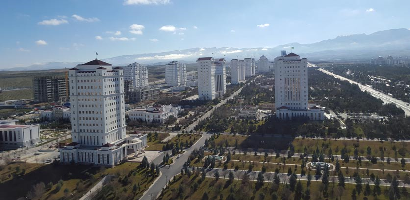 アシガバットは、アシガバード、アシハバード、アシハバットとも呼ばれるが、その意味は「愛の町」とのことであり、もともとはカラクム砂漠の中のオアシス、近年はガス収入の恩恵を受け、市内には世界一多い噴水と大理石張りの建物が集中(共にGuinness World Records)、行き交う自動車もきれいに磨かれ(汚れていると罰金を科せられるため)、また、安価なガスを使用した電力供給から夜中も照明がこうこうとともされ、夜は人通りのないラスベガスあるいはディズニーランドの様相を呈している。