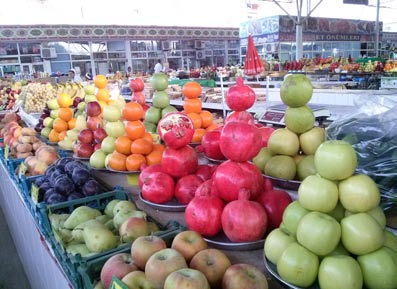 アシガバット市内の市場:通称「ルスキー(ロシアン)バザール」。季節の果物、野菜をはじめとした食料品、日常雑貨が並ぶ