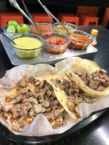 メキシコ料理で有名なのが、すりつぶしたトウモロコシの粉から作った薄い生地(トルティーヤ)にさまざまな具を包んで食べるタコスかと思います。値段は1個当たり10ペソ(約50円)前後で、日本でいうおにぎりのような感覚で気軽に食べられます。日本では飲みに行くと〆のラーメンですが、こちらの人たちは〆のタコス。夜になると街中のあちらこちらに屋台が出てきて、その店ごとに特徴のあるタコスを提供しています。チーズが入ったケサディージャ、パン生地に具材を挟むサンドイッチ形式のトルタなどさまざまなバリエーションがあり、中に挟む具材も牛肉、豚肉、鶏肉、海鮮と多岐にわたります。ライムを絞りお好みのソース(サルサ)をつけ、味を変えながら楽しみます。
