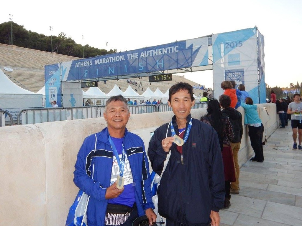 CMCの仲間と行った初めての海外遠征、アテネマラソンも忘れられない思い出です。マラトンからアテネ古代競技場までのコースでアップダウンが多く6時間もかかり完走しましたが、撮ってもらった写真には充実感が満ちあふれているようです。