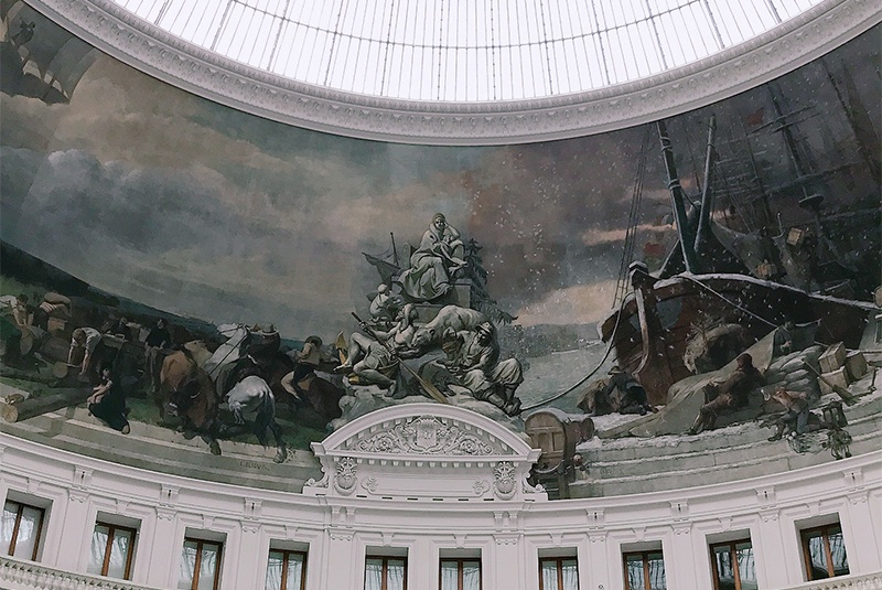 2021年の5月22日に多くの人の期待を背負い、新美術館ブルス・ドゥ・コメルス・ピノーコレクションはオープンしました。今世紀初めまで穀物取引所として機能していた歴史的建造物が、フランスきっての大富豪、フランソワ・ピノー氏の現代アートコレクションを展示する美術館として生まれ変わりました。その設計を担当したのが日本人建築家、安藤忠雄氏です。歴史ある建物の外部はそのままに、内部は自然光が注ぐ強大な吹き抜け空間に円筒コンクリート製の展示スペースをつくり、その周りを展示室が取り囲む形となっており、暖かな天然光が差し込むガラスと鉄の天井、それを彩る壁画の融合がとても素晴らしいです。安藤氏の建築はオープン前からさまざまな媒体で取り上げられ、こちらでの人気も高く、新しい芸術の発信地として、欧州各国より多くの見学者が訪れています。