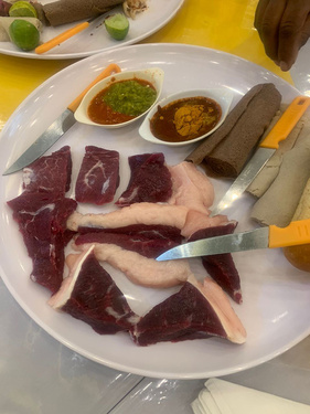 写真のプレートは、地元の人気店「Mezgebe」のものです。こちらのプレート1種類のみを提供するレストランで、日曜日には満席になる人気店です。自分でナイフを使い生肉を小さく切り、スパイスに付けてインジェラ(巻いてお皿に載っている)と共に食べます。