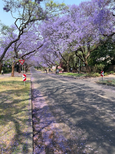 ヨハネスブルグの街並みは緑が多く、季節ごとに色とりどりの花が咲いています。特に有名なのは薄紫色の花弁をつけるジャカランダで、南アフリカの春に当たる10—11月にちょうど満開となり、多くの人々の目を楽しませます。春に咲く、その国を代表する美しい花、というイメージから、よく日本での桜のような花だと私も話をしています。南アフリカの首都の一つであるプレトリアは別名「ジャカランダシティ」とも呼ばれており、およそ7万本のジャカランダの木が植えられています。成長のために大量の水を必要とする性質があるため、水資源があまり豊富でないプレトリア周辺のエリアでは勝手に植えることが禁止されている植物でもあります。満開の時期に道路をドライブしていると、ジャカランダが美しく咲き誇る中を通り抜けることができるのですが、薄紫に包まれてなんとも幻想的な気分を味わうことができます。日本の旅行会社の中にもジャカランダツアーを売り出している会社があります。日本でも観賞できることがあり、一時帰国中に熱海へ家族で旅行に行った際、タクシーの運転手さんから「この辺りでジャカランダっていうきれいな花が咲いているんだけど、ジャカランダって見たことあるかい?」と聞かれた時は、思わずにやりとしてしまいました。