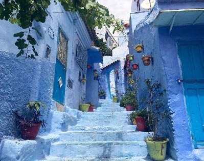 そして街ごとにテーマカラーが異なるのもモロッコの特徴です。商業都市カサブランカ(スペイン語で「白い家」)は白、マラケシュはバラ色(土壁の色)、そして昨今観光でも人気のあるシェフシャウエンは、町が青で染まっています。家を青に染める習慣は蚊を避けるため、暑さを避けるため、と機能的な理由から始まったそうですが、目に鮮やかな街並みは今や世界中の人々をとりこにしています。