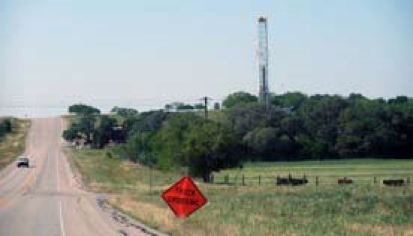 郊外の牧場奥のガス掘削リグ