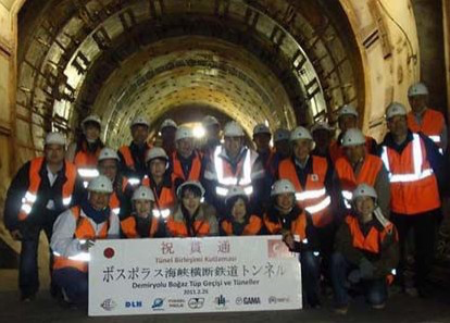 ボスフォラス海峡には欧州とアジアを物理的に結ぶ2つの大きな橋が架けられています。第1の橋(1973年完成)はイギリスの技術で、第2の橋(1988年完成)は日本の技術によって架けられ、まさに両大陸をつなぐ大動脈です。トルコの社会経済の発展に伴い、この2つの橋はいつのときもたくさんの車が行き交う忙しい橋となっています。第3の橋が強く望まれる中、2003年に何とボスフォラス海峡の下に鉄道を通すという事業(ボスフォラス海峡横断鉄道)が日本の技術で始まることになりました。2008年にNHKの番組「沸騰都市」でも紹介されましたが、トンネルを掘るというよりトンネル(沈埋函)を敷くといった表現がぴったりの独創的な工法で世界最深沈埋トンネル(海面下60m、全長1,387m)の工事が進められ、私の駐在期間中、まさに突貫工事が続けられています。そんな折、2011年3月に事業企業(大成建設)様より機会を頂き、貫通直後のこの沈埋海底トンネルを歩いて渡るという得難い経験をすることができました。2011年2月にトンネル内で行われた貫通式の式典にはエルドアン首相も出席されましたが、その貫通式の式典現場(トンネルの中間点近辺。その場所で記念撮影)へ向けて欧州側(シルケジ駅西立坑現場)から歩き、アジア側(ウスクダル駅舎現場)へ抜ける約4㎞の徒歩ツアーでした。歩行中、「今、海峡の真ん中の地点まで歩いてきました」との説明を受けた時に感じた「この上60mに海面があると思うとゾクゾクするなんとも言えぬ感激」は今でも体の中に残っています。それにしても、よくもまあこんなすごい事業をやってのけるなんて(橋とは違って、地図に載るのかどうか分かりませんが)、現代の「アヤソフィア建設」とも言うべき偉業を成し遂げるなんて、すごいことだと、日本人として、自慢したくなる気持ちです。