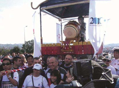 また、「日本年」文化事業を通じて、文化交流のさまざまな場面でイスタンブル日本人学校の児童・生徒さんに活躍いただきました。イスタンブールには約1,000人の在留登録日本人がいますが、この「日本年」文化事業を通じて、交流の輪が広がり、societyとしての絆が深まったのではないかと思っています。毎年10月にイスタンブールで行われるユーラシアマラソン大会のフリーランの部に「日本年」記念イベントとして日本人会の文化行事として参加し、みこしを担ぎ出し(実際は引っ張りましたが)、イスタンブー ル市長との記念撮影にも成功し、みんなで第一ボスフォラス大橋を2本の足でさっそうと(?)駆け抜けました(普段は歩行禁止です。歩行者があるとすれば、橋の中央から身を投げることを考えて歩く人くらいです)。