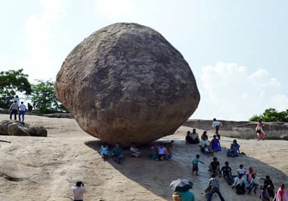 チェンナイから90分ほど海沿いに沿った道を南へ走ればマハーバリプラム(マーマッラプラム)の遺跡に到着します。7世紀のドラヴィダ文化の寺院遺跡がベンガル湾に面して連なっており、素晴らしい岸壁彫刻群がインドの悠久の歴史を感じさせてくれます。遺跡にあまり興味のない方にもお勧めなのが、「クリシュナのバターボール」と呼ばれる巨大石の遺跡です。ヒンドゥー教の神様の1人「クリシュナ」の好物であるバターボールにその形が似ているということからこの名が付いたといわれています。横から見れば確かに急斜面に置いてある丸いバターのようで、この見るからに不安定な巨大石がどうして転がり落ちないのか非常に不思議です。周りでは暑さを避けて石の陰で昼寝をする人たち、何とか石を動かしてやろうと必死の形相で力を入れる人たちが交じり合い、ここ世界遺産でも毎日がお祭り状態です。