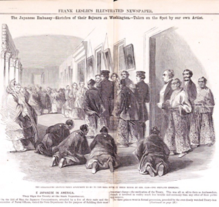 この描写は、歓迎レセプションで、使節団の正使である新見豊前守正興が、米国側の代表者と共に部屋から出て来た際に、随行の武士たちが、多くの米国人が見ている中で、恥らいもなく土下座をしている姿である。生まれながらにして身分が決まる厳しい階級社会の日本と、大統領が一般市民の選挙で決まる米国社会との対照性を表した絵でもある。大河ドラマ「龍馬伝」の龍馬の言葉を借りれば「上士も下士も分け隔てなく暮らせる世の中」がまさに米国であろう(なお、坂本龍馬が暗殺されるのは1867年、この使節団の7年後)。