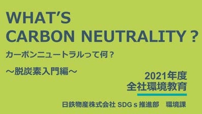 当社は、ESG経営に関する重要課題(マテリアリティ)の一つに「脱炭素社会・環境保全への貢献」を掲げ、2050年カーボンニュートラルを目標に、CO2排出量の削減や、事業を通じたエコソリューション提案等を通じ、持続可能な社会の実現に貢献すべく、全員参加による取り組みを進めている。その一環として、2021年度は従業員への意識浸透を図るため、全社員を対象とした環境教育を実施した。社内メンバーが作成した動画を配信し、地球温暖化の影響、脱炭素を巡る世界の動向、当社のCO2排出削減目標および私たちにできること等について、説明を行った。