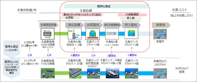 現在、建設工事および実証運転の開始に向けた技術調査を実施しており、その実証地として液化水素の出荷地は豪州ビクトリア州ヘイスティングス地区、受け入れ地は川崎臨海部とした。今後、NEDO、当社、日本水素エネルギー、ENEOSは、2030年に水素供給コストでN㎥当たり30円(船上引き渡しコスト)を達成するクリーンな液化水素の海上輸送技術の確立を目指す。さらに水素発電実証を実施する需要者や地元自治体などとも連携し、2050年までのカーボンニュートラル実現に向けて商用規模での国際的な液化水素サプライチェーンの構築に貢献していく。